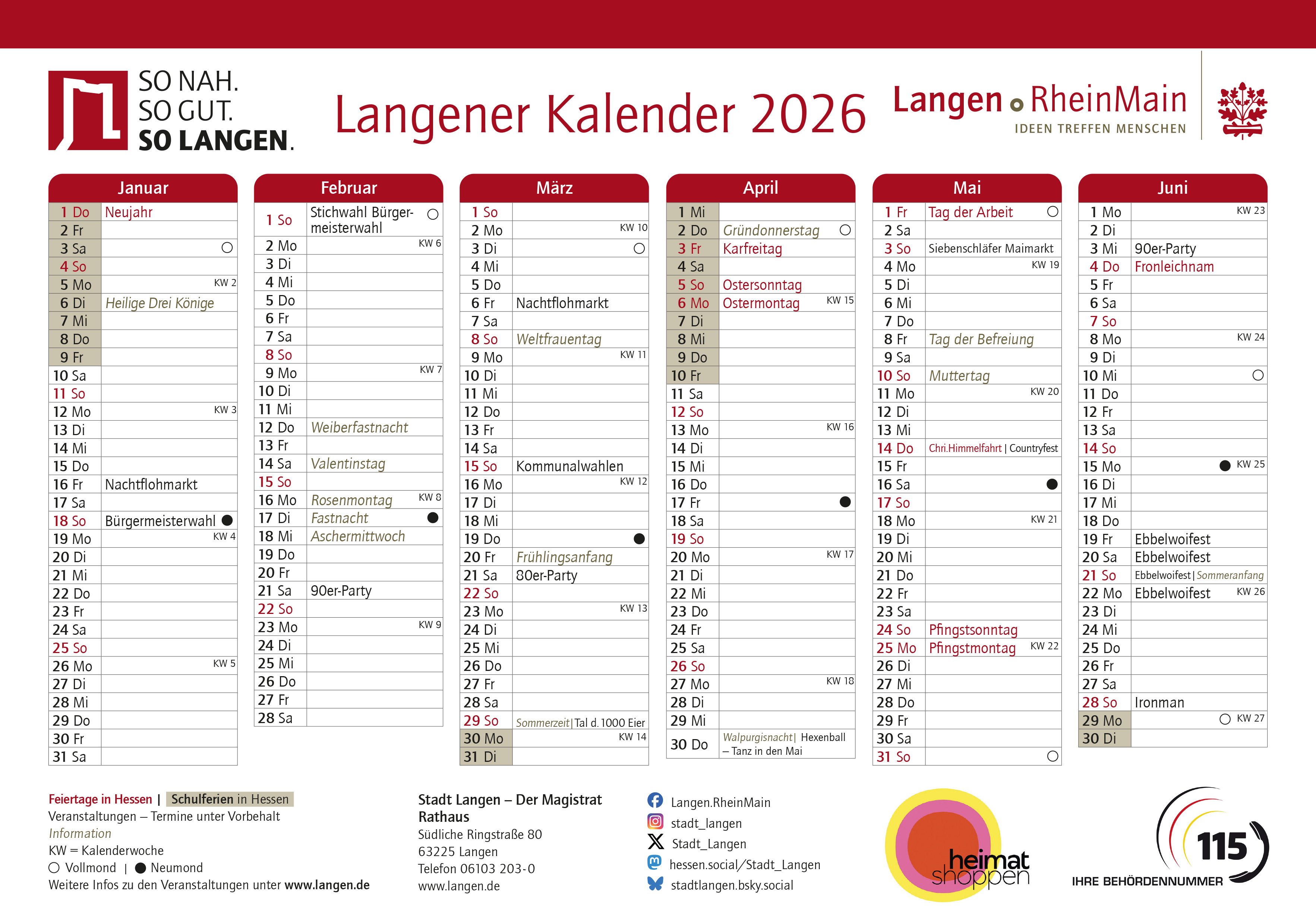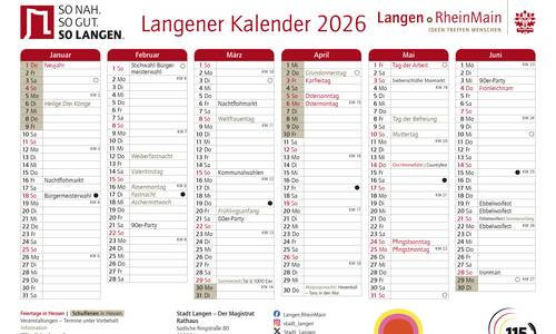 In Langen wird viel geboten im Verlauf eines Jahres. Das ist auch 2026 wieder der Fall. Die Termine von Veranstaltungen, Märkten und mehr finden sich auf der städtischen Website www.langen.de. Einen kleinen Auszug bietet darüber hinaus der „Langener Kalender“, den die Stadt auch für das kommende Jahr wieder erstellt hat. Auf zwei DIN A4-Seiten bietet das Kalendarium einen Überblick über die Langener Großveranstaltungen wie Ebbelwoi- und Weinfest oder beliebte Veranstaltungen wie die 80er- und 90er-Partys in der Neuen Stadthalle Langen. Auch die Termine der Wahlen 2026 sind in dem beliebten Kalender aufgelistet, ebenso Schulferien und Feiertage.