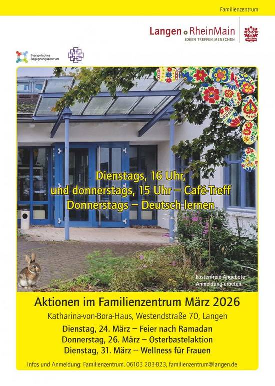 Mit mehreren Veranstaltungen begrüßt das städtische Familienzentrum im Katharina-von-Bora-Haus an der Westendstraße 70, den Frühling. Den Auftakt bildet am Dienstag, 24. März, von 15.30 bis 17.30 Uhr eine Feier nach dem Ramadan. Die Teilnehmerinnen und Teilnehmer sind eingeladen, kleine Speisen für ein gemeinsames Buffet mitzubringen.