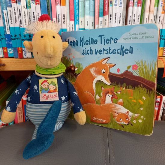 Der Bücherzwerg bringt dieses Mal das kleine Buch „Wenn kleine Tiere sich verstecken“ mit. Wo stecken bloß die Tierkinder? Sitzen die kleinen Füchse etwa hinter Mamas buschigem Schwanz? Da taucht das Walkind hinter der Flosse des großen Wals auf. Und das Orang-Utan-Baby kuschelt sich fest an Mutters Bauch.