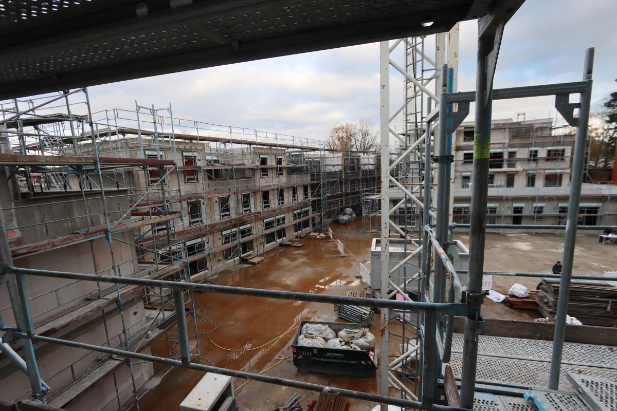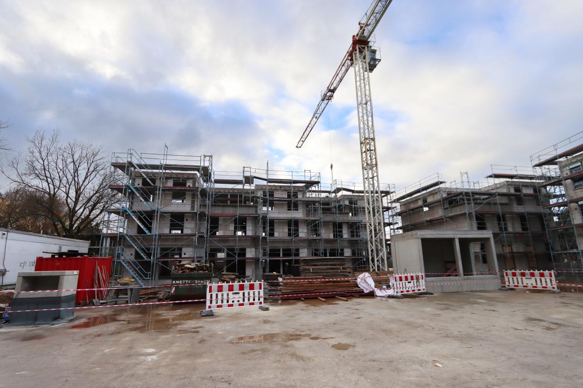 Am südöstlichen Ende des Grundstücks liegt das Mehrfamilienhaus, das im Erdgeschoss eine zweigruppige Kita aufnimmt. In den Obergeschossen liegen in Summe neun Wohnungen, wovon eine Wohnung im 1. Obergeschoss für die Kindertagespflege genutzt werden soll. Zwei der neun Wohneinheiten und die Kita im Erdgeschoss sind barrierefrei gestaltet. Neben dem Mehrfamilienhaus gliedern sich zudem 16 Reihenhäuser in vier Hausgruppen mit zwei bis fünf Einzeleinheiten. Diese bestehen je aus zwei Vollgeschossen, einem Staffelgeschoss und sind über das Untergeschoss ebenso mit der Tiefgarage verbunden.