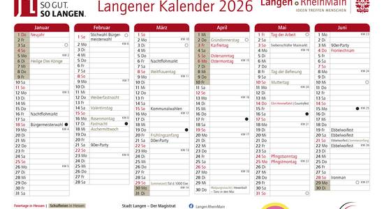 In Langen wird viel geboten im Verlauf eines Jahres. Das ist auch 2026 wieder der Fall. Die Termine von Veranstaltungen, Märkten und mehr finden sich auf der städtischen Website www.langen.de. Einen kleinen Auszug bietet darüber hinaus der „Langener Kalender“, den die Stadt auch für das kommende Jahr wieder erstellt hat. Auf zwei DIN A4-Seiten bietet das Kalendarium einen Überblick über die Langener Großveranstaltungen wie Ebbelwoi- und Weinfest oder beliebte Veranstaltungen wie die 80er- und 90er-Partys in der Neuen Stadthalle Langen. Auch die Termine der Wahlen 2026 sind in dem beliebten Kalender aufgelistet, ebenso Schulferien und Feiertage.