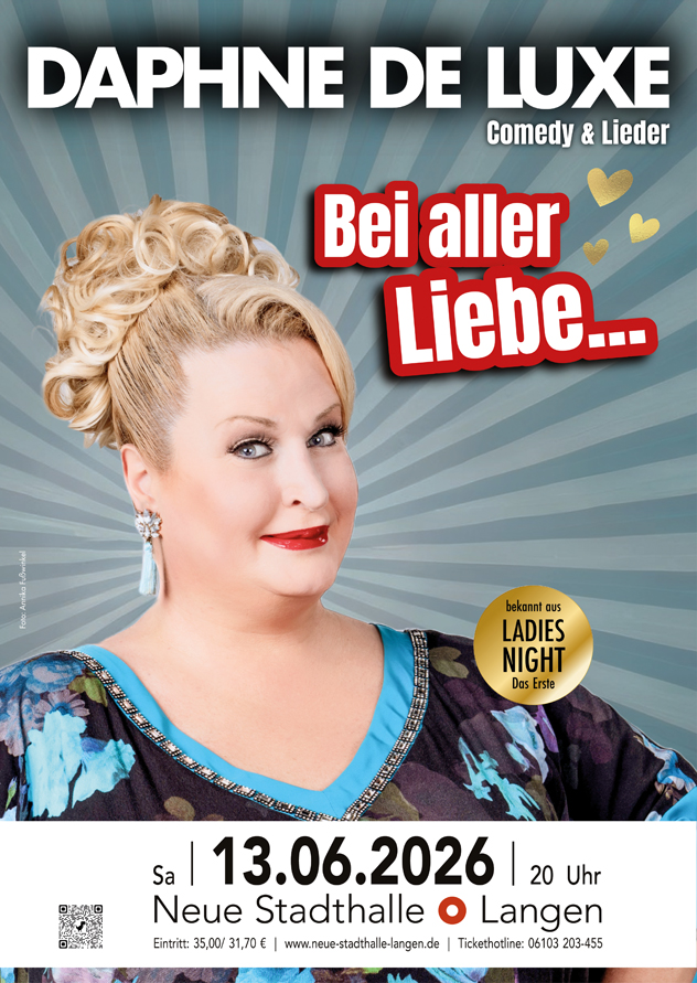 Im neuen Programm von Daphne de Luxe liegt Liebe in der Luft! Mit einer gehörigen Portion Humor, viel Herz und reichlich Lebenserfahrung nimmt sie ihr Publikum mit auf eine spannende Reise durch die unendlichen Facetten der Liebe - von der unerfüllten Jugendliebe über die Höhen und Tiefen romantischer Beziehungen bis hin zur oft vernachlässigten Nächstenliebe in unserer hektischen Welt. Und wer glaubt, über die Liebe wurde schon alles gesungen, darf sich auf eine musikalische Besonderheit des neuen Programms freuen: Erstmals präsentiert Daphne de Luxe ausschließlich eigene Lieder.