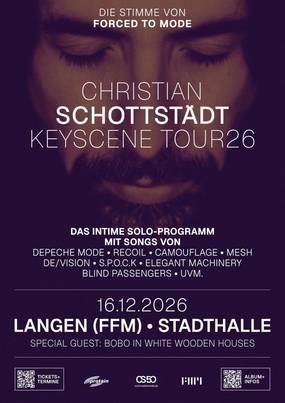 2025 veröffentlichte der charismatische Sänger sein erstes Soloalbum namens „KEYSCENE“. Dafür produzierte er in Eigenregie diverse Klassiker und Raritäten der Synthpop-Szene (ua. von Camouflage, De/Vision, Blind Passengers, Mesh, S.P.O.C.K oder Elegant Machinery) in seiner ganz wundervollen, melancholischen und cineastisch-minimalistischen Sprache. Durch die eindringliche und berührende Stimme und die berührenden Pro-duktionen verlieh Christian Schottstädt den Songs einen ganz eigenen, fühl- und spürbaren Glanz.